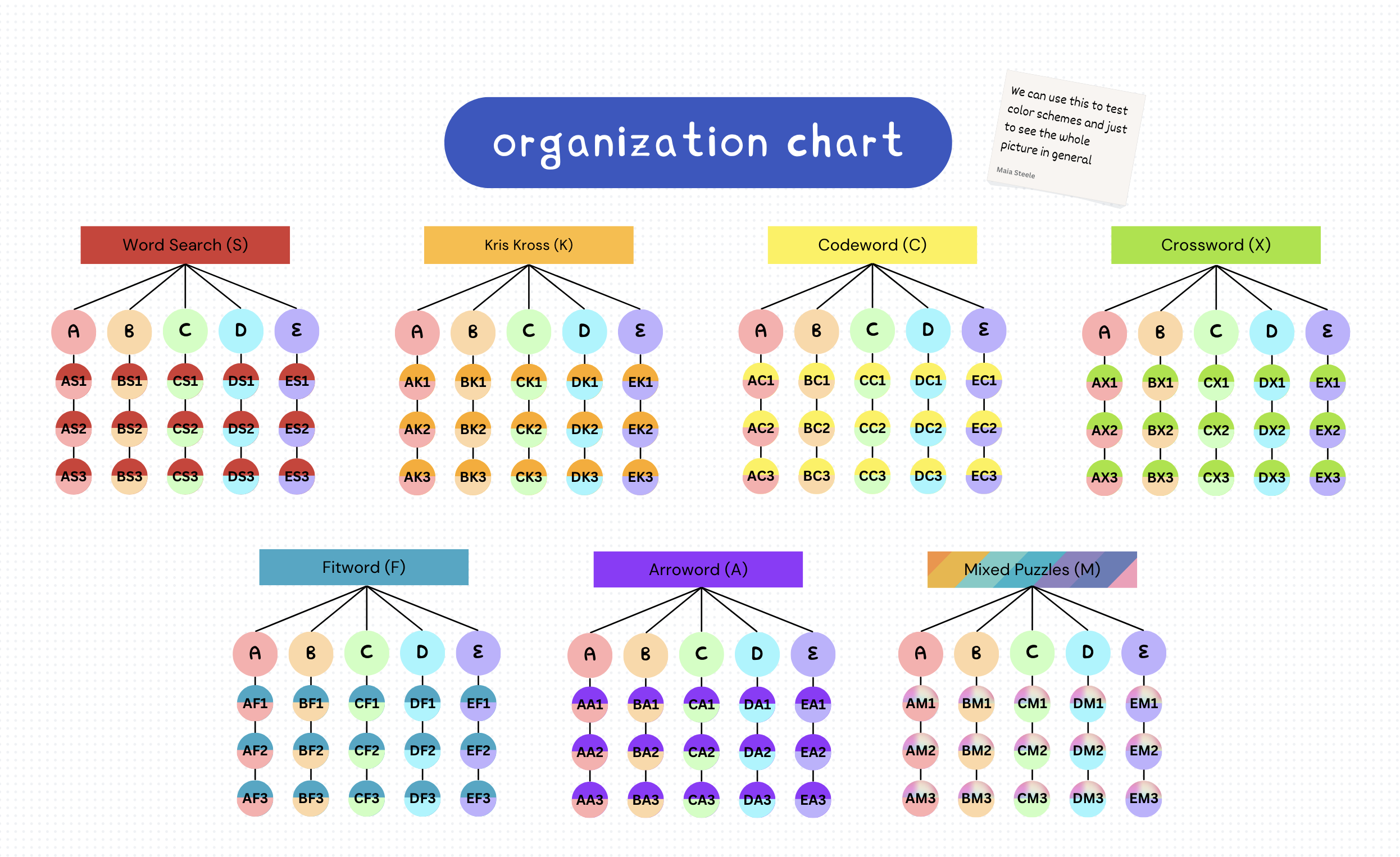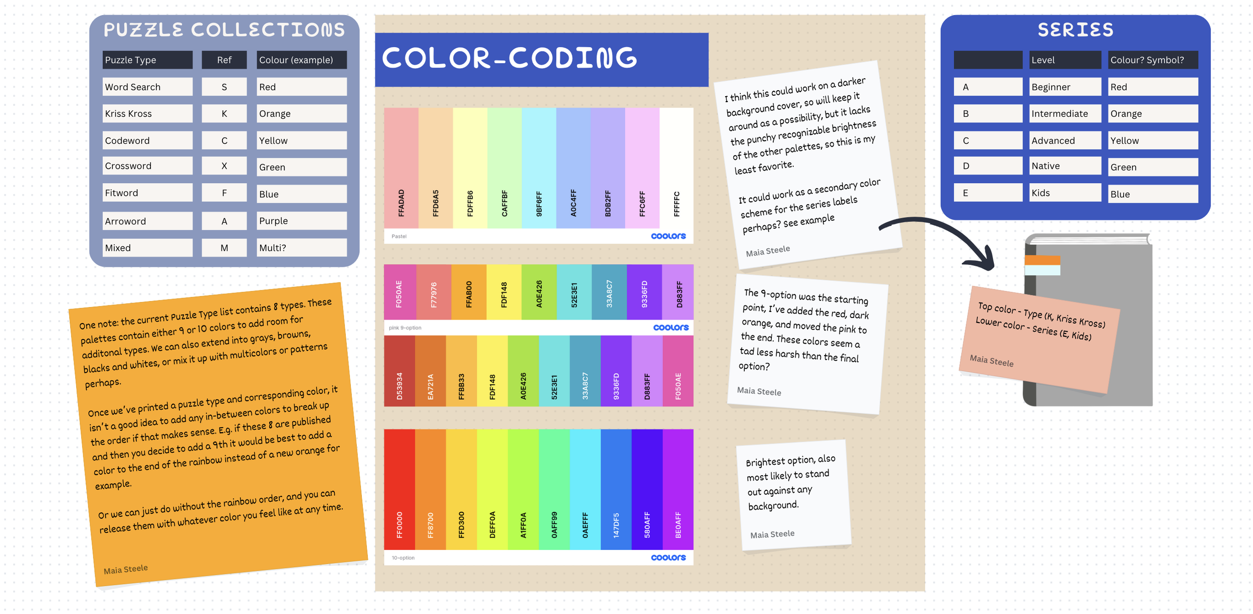 As we began designing the first cover, it became clear that the author planned not only additional editions of the word search book but also other types of puzzle books in the future. To ensure the series felt cohesive while still allowing readers to easily identify each title on a bookshelf, we developed a colour matrix. This system used carefully selected colours and stripe patterns on the spine to indicate both the edition and the type of puzzle book. The results can be seen in the visuals above and below.
